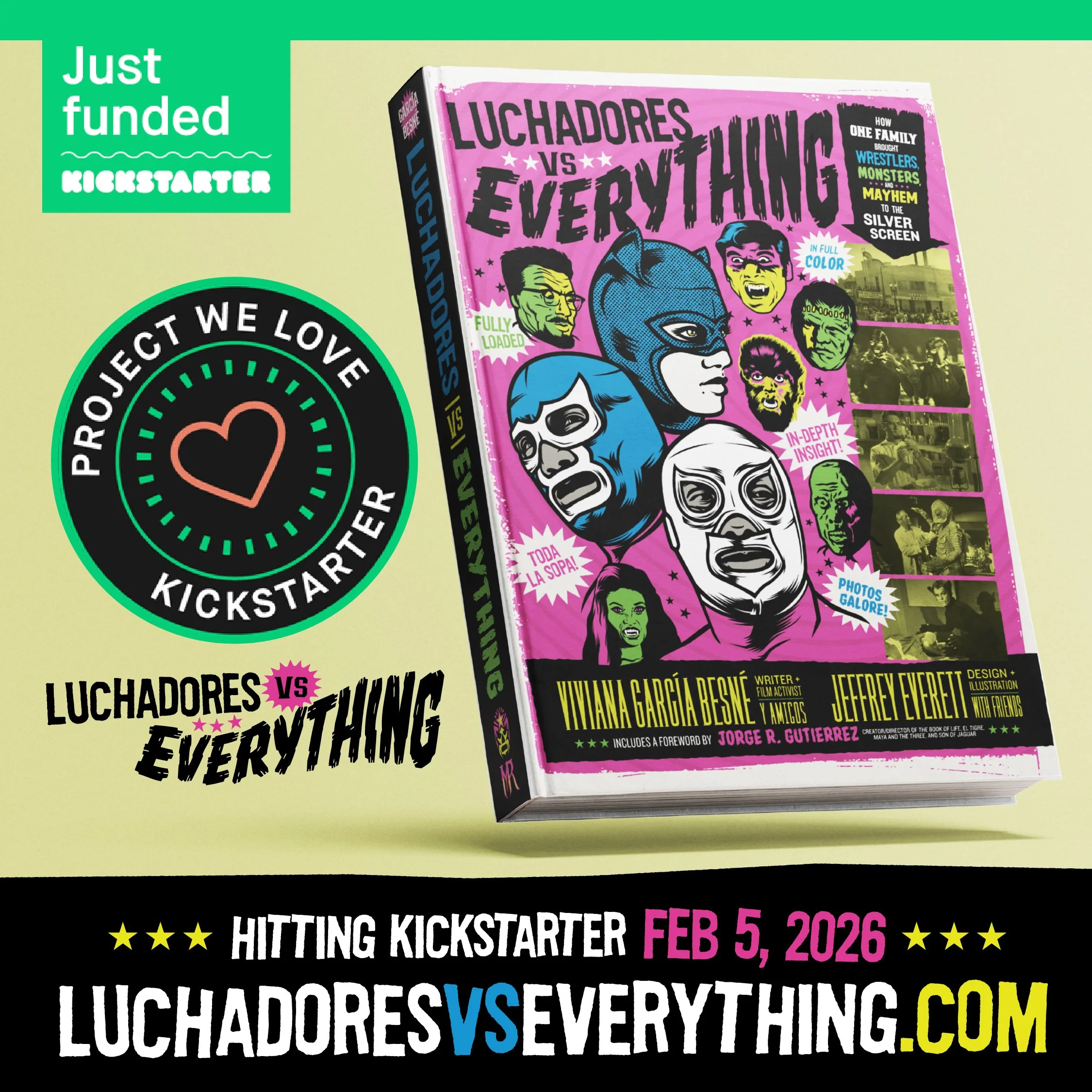 We are thrilled to announce that the official Luchadores vs Everything Kickstarter Campaign will begin FEBRUARY 5, 2026! Visit the new BOOK section to see the initial list of contributors and artists, including a foreword by Emmy and Annie Award-winning creator/painter/writer/director Jorge R. Gutiérrez. Check out the spectacular list of people who are working so hard to make this book as legendary as the luchadores AND monsters inside of it!